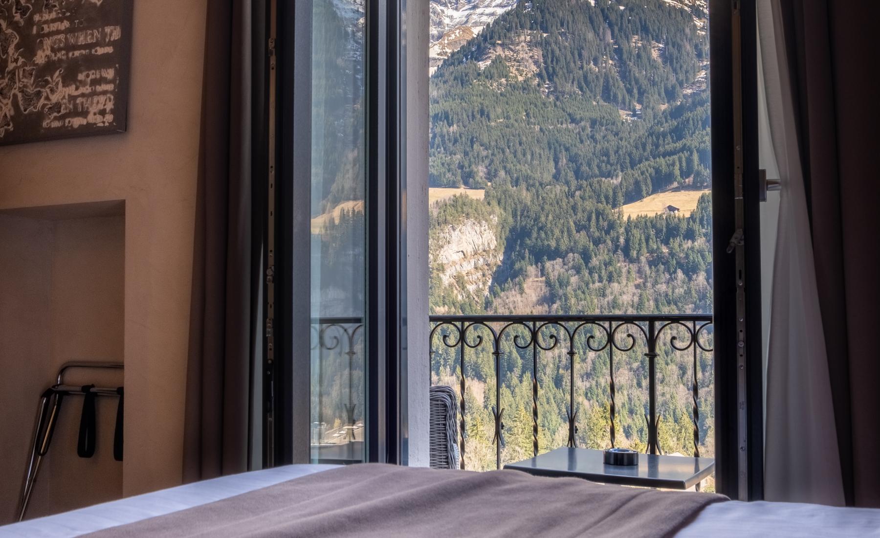 Komfortables Zimmer mit Balkon oder Terrasse und Blick auf die majestätischen Dents du Midi. Es gint ausserdem die Möglichkeit zwei angrenzende Zimmer zu beziehen.